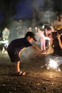 「火」の熱さを知らない子供たちに、火を体験してもらおうと開催されている境内で行う手持ち花火大会です。