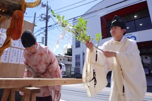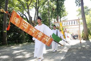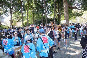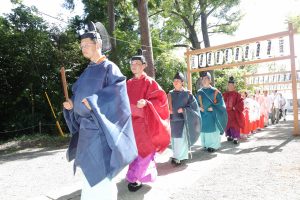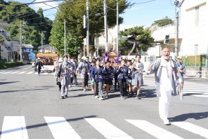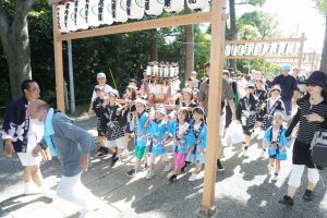 神職、総代、雅楽を演奏する伶人、明神台子ども会子ども神輿、が一緒に神社へ渡御をします