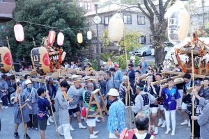 4町内の神輿が星川1丁目公園に集合し、「星川町交差点」で揉み合います
