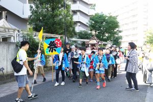 明神台集会所出発 斎主斎員、総代に続き、明神台こども神輿が渡御