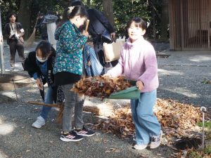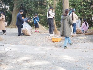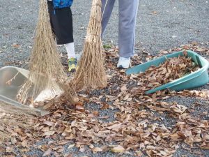 神社の境内を、竹ぼうきで掃いたり、落ち葉集めをしましょう。必要な方は軍手をご持参ください。